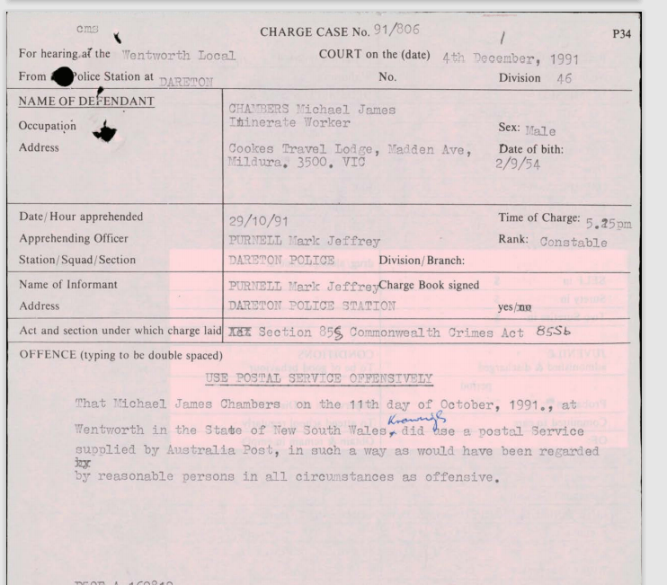 This Charge sheet copy is taken from the 1992 Wentworth NSW Local Magistrates Court August Trial transcript which is in the Local Court level attempted whole matter PDF.