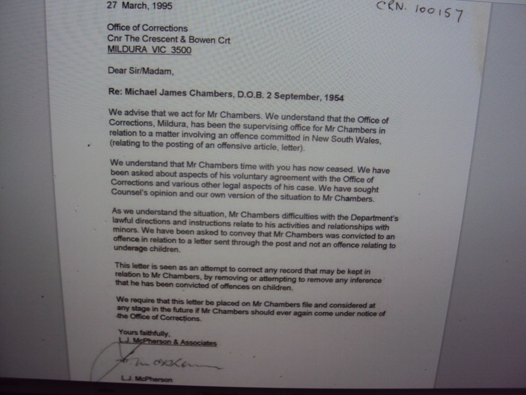 The above is a letter from Les McPherson Solicitor from LJ McPherson & Associates Solicitors Mildura Vic in relation to my time at Vic Corrective Services Mildura where people from the near NSW side of the border are sent for NSW orders.